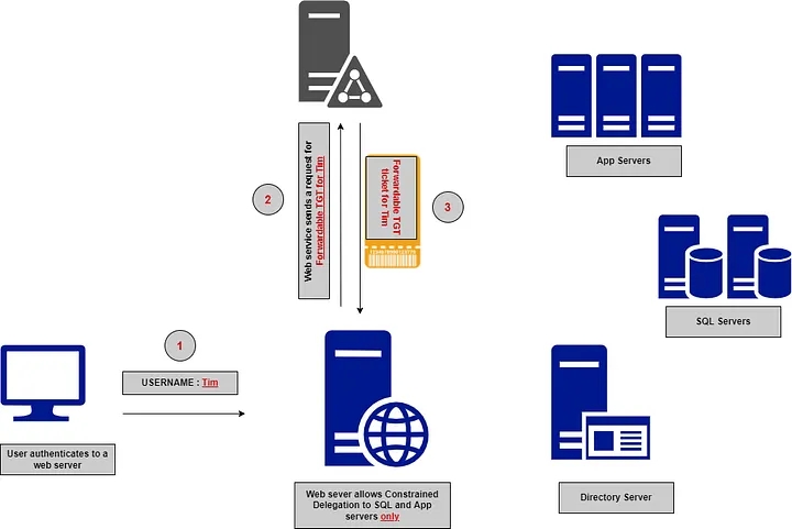 To understand the authentication flow, let’s take an example of a user authenticating to a constrained delegated account like a web service account that only allows delegation to SQL services. The authentication flow would consist of five(5) main steps.