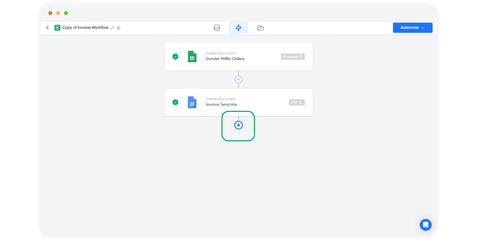 Once you have configured your workflow and added the source and template blocks, click on the plus icon to add an email block: