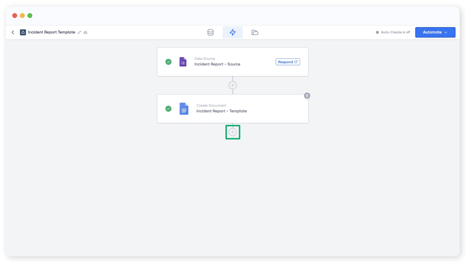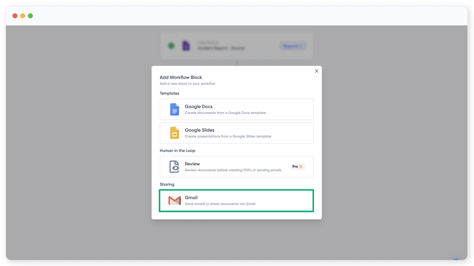 To add an email block click the '+' icon below the document block and select the Gmail block: