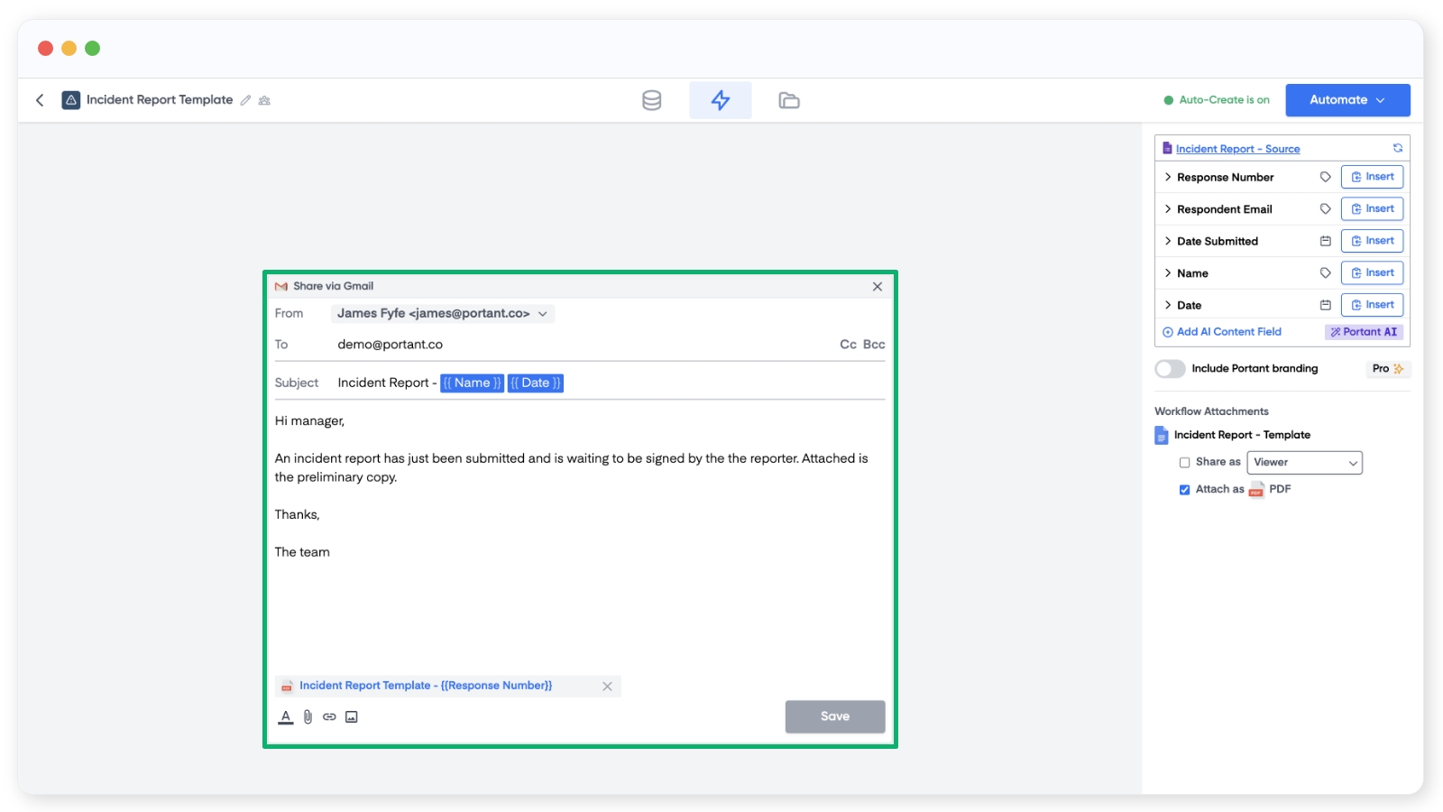 You can also attach document output(s) from your workflow to the email. For example you can select to share Google Slides/Docs with Viewer, Commenter or Editor permissions or attach a PDF to the email.