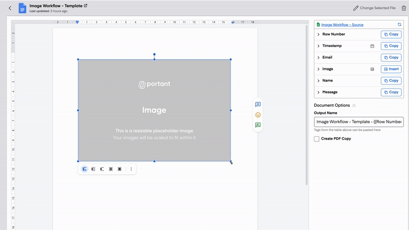 Portant Workflow can add images to your template. All you have to do is identify a source row as an image and insert the placeholder image, and after that, you can edit the position and size of the image.