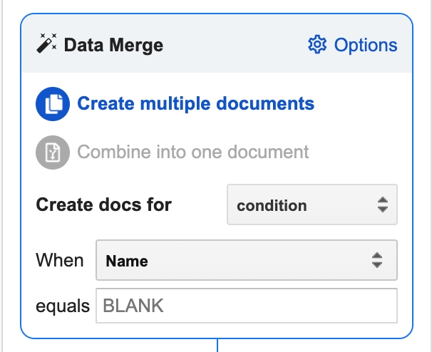 Conditional logic is a great setting if you want to create documents only from certain rows within a spreadsheet. It can be selected from the dropdown list within the Data Merge box.