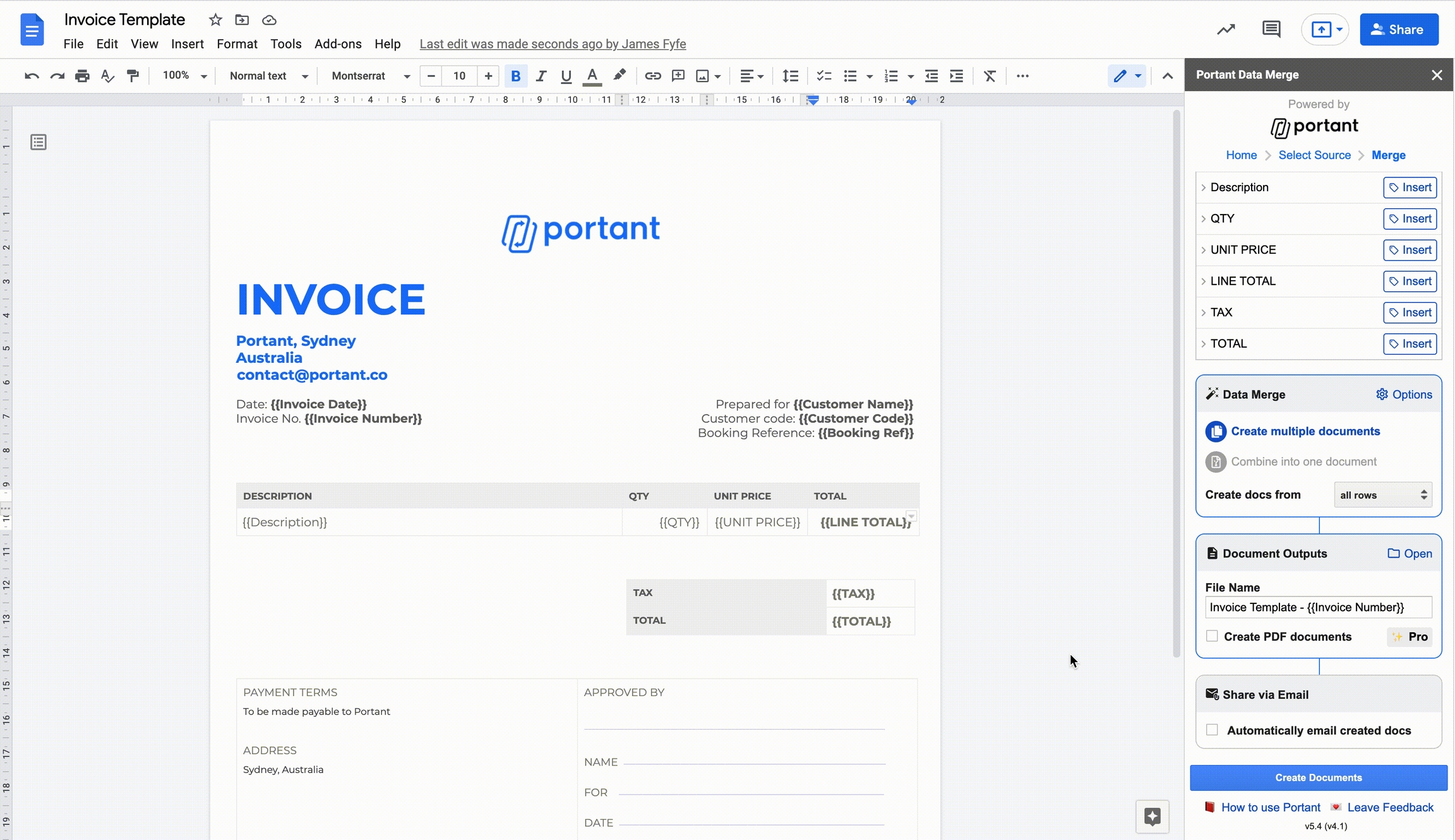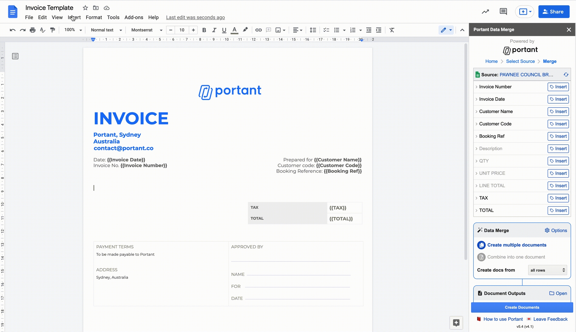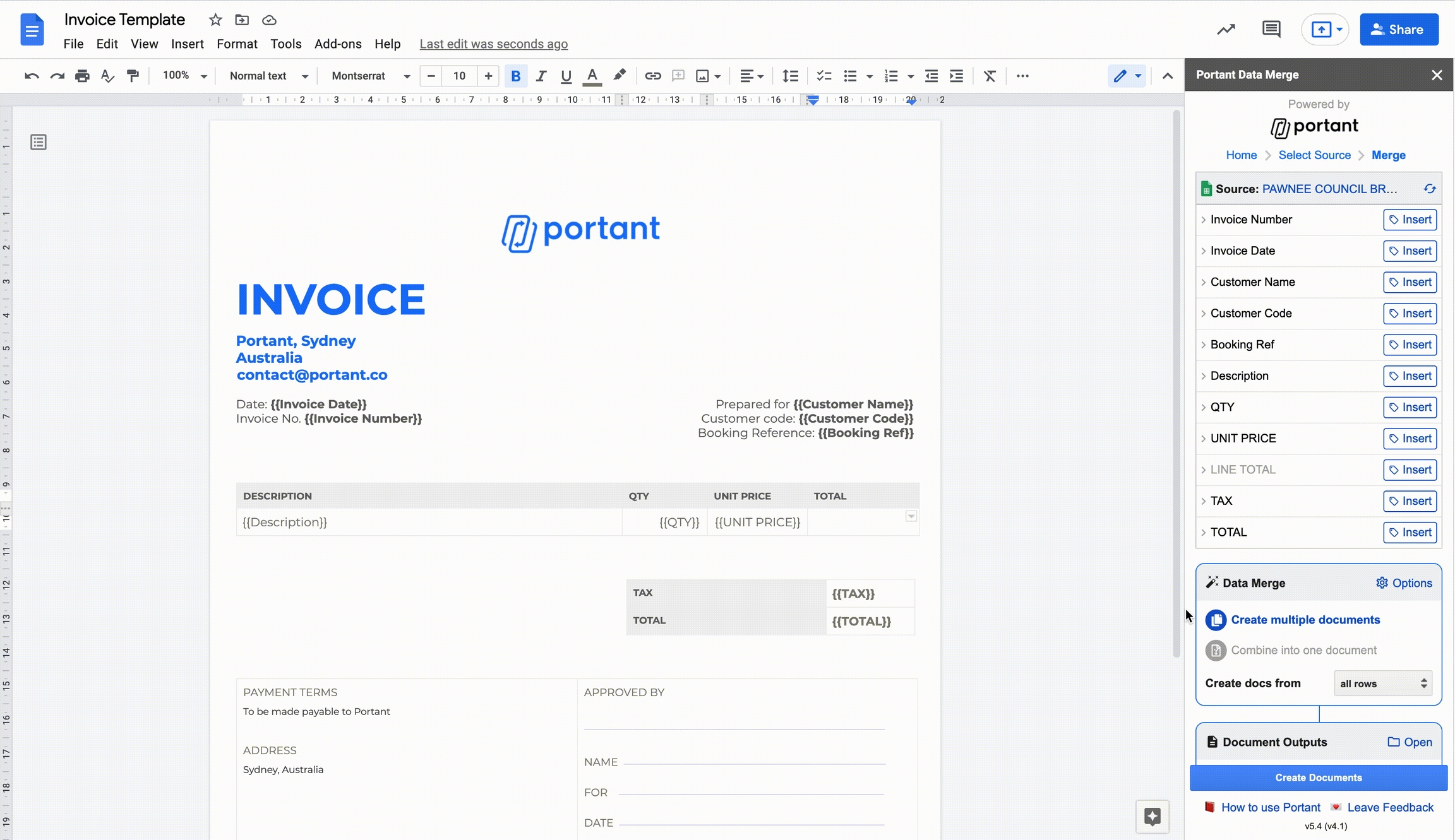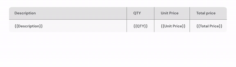 Portant Data Merge can group data within your source spreadsheet and place it into tables within your document. If your source spreadsheet contains multiple rows that should be grouped and inserted into one table then this is the feature for you. A good example use case is when you need to include multiple Google Sheet rows into an invoice template or purchase order.
