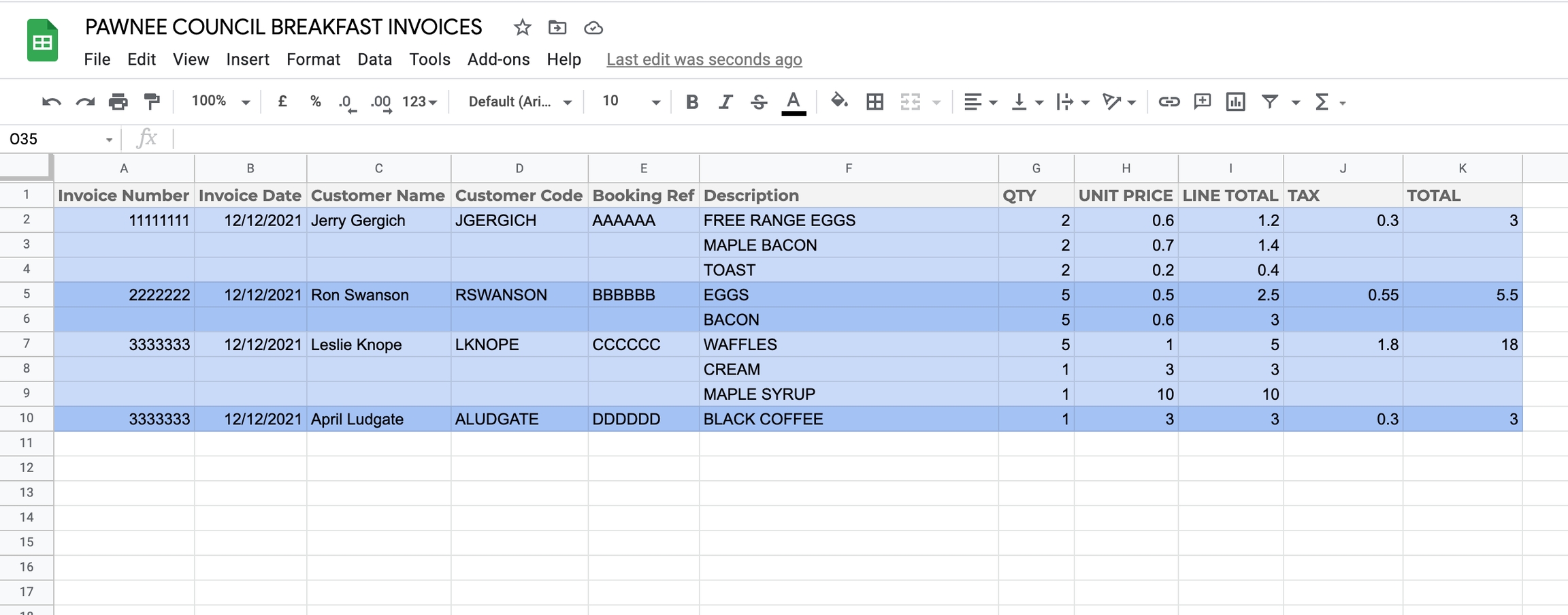 In the example above we have grouped by invoice number because we want to create a separate document for each unique invoice number as shown in the source spreadsheet below.
