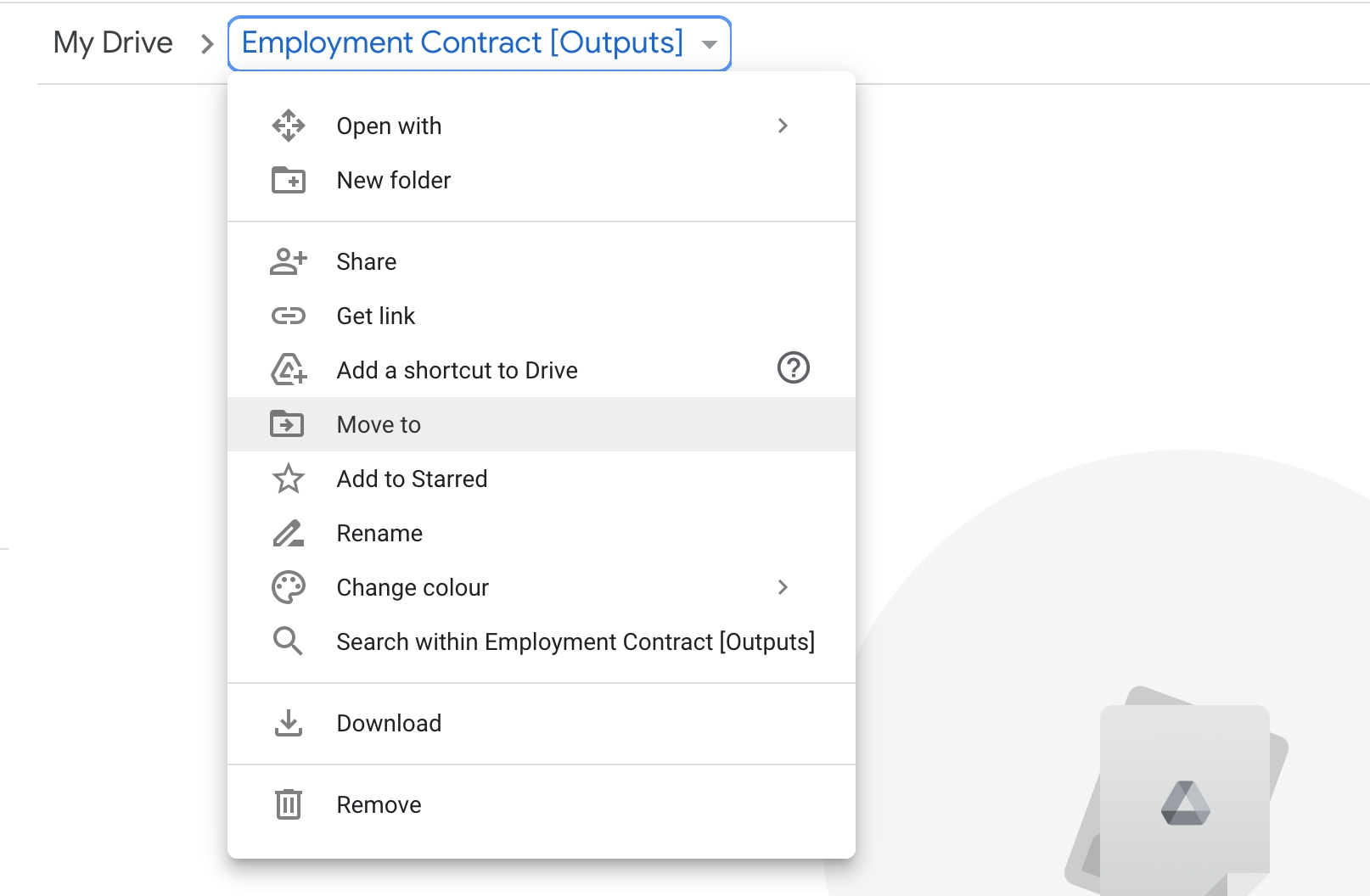 Then when the new page opens, click the folder name at the top of the page and select 'Move to' from the menu that drops down.