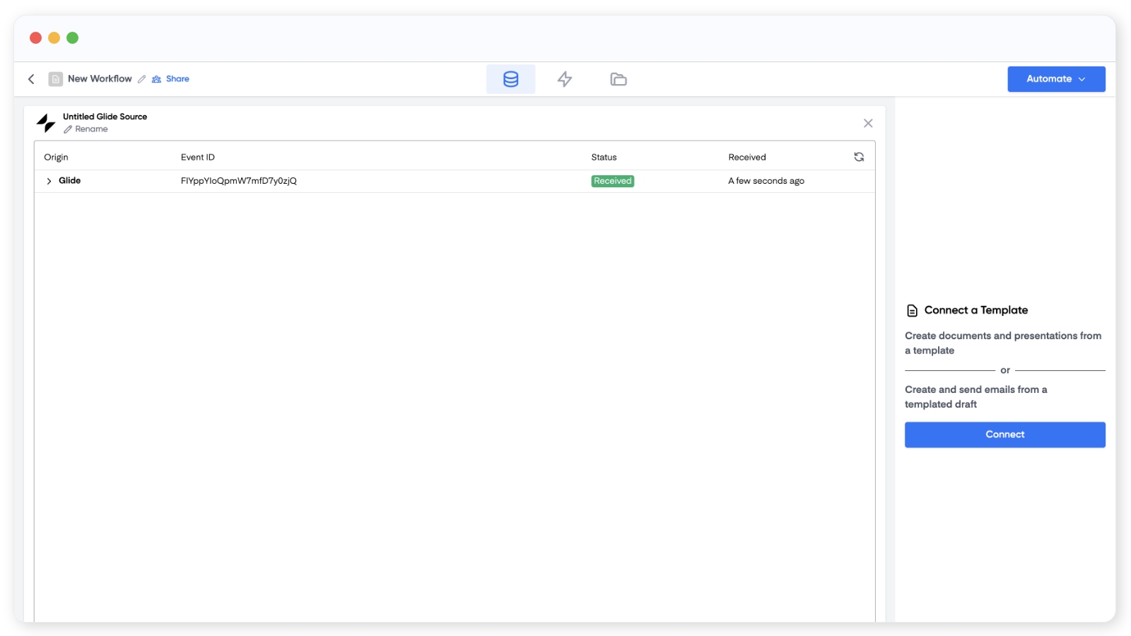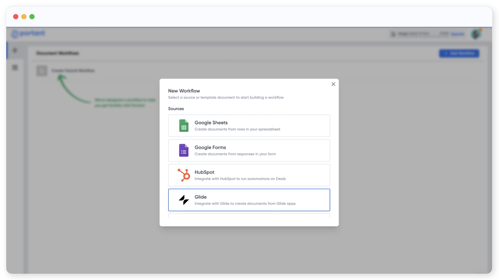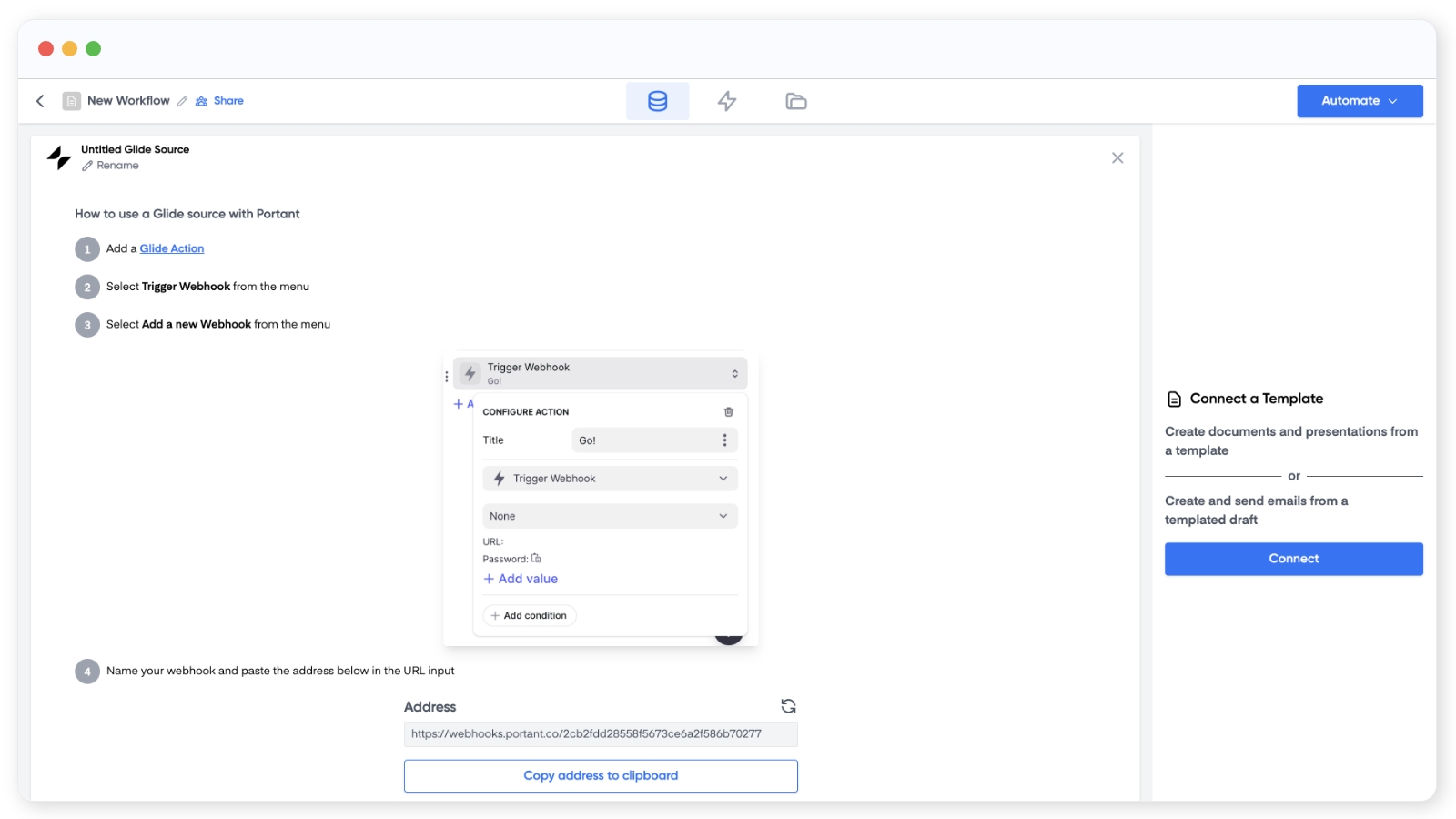 Now you have successfully connected Portant to Glide, the next step is to connect a document template. You can do this by clicking the Connect button in the right panel. Here you can select to connect a Google Doc, Slides or even email template to be customised and generated from Glide data.