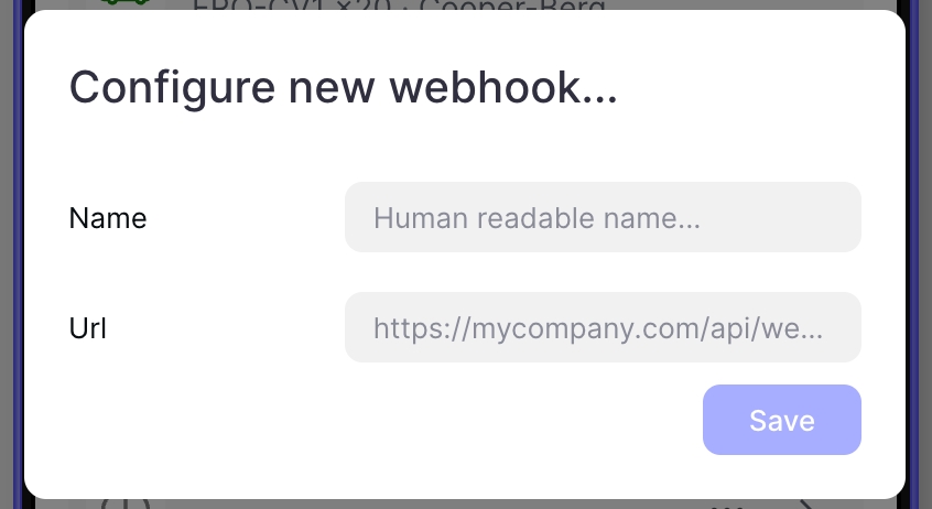 When you click 'Add new Webhook' a new modal pops up where you can name it and add a webhook address. The webhook address shown in step 4 of the Glide Source Block in Portant.