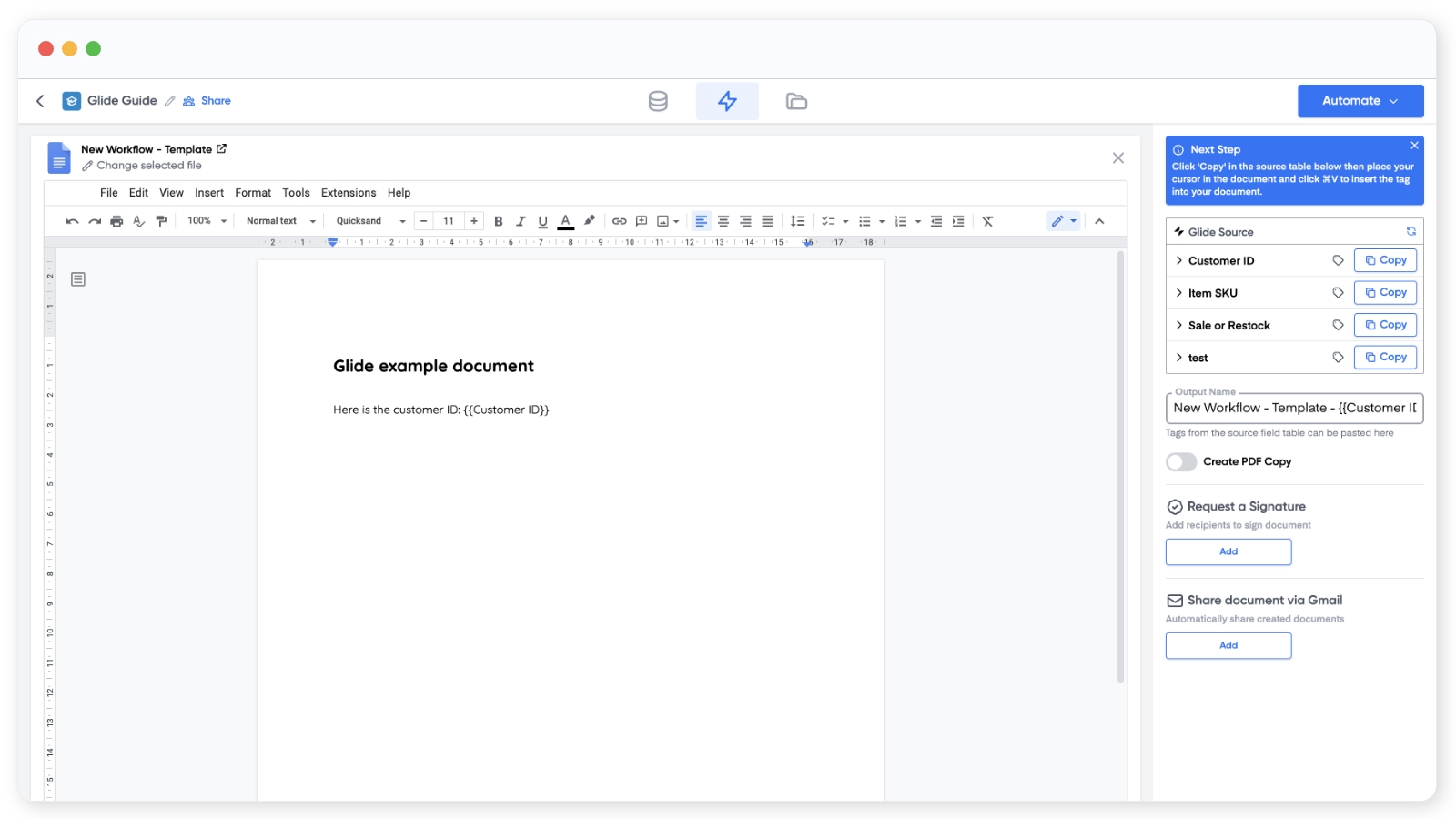 When you have picked your document template, you can customise it by placing Glide tags from the Source table into the document. To insert a tag, click Copy and then insert your cursor where you'd like the tag to be placed and hit CTRL + V or CMD(β) + V
