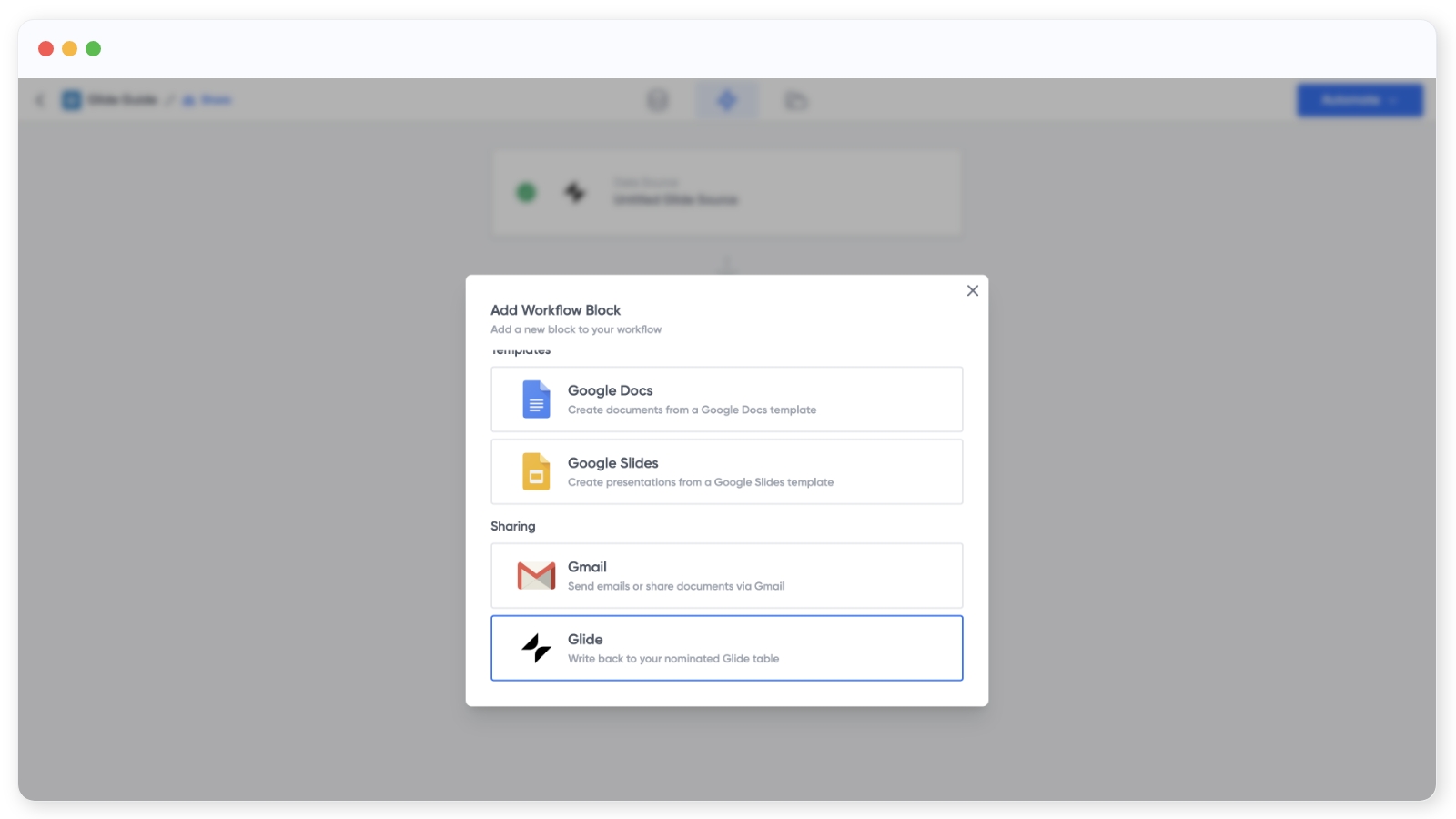 After you have set up a column for the document link, you can select to send the document links back to Glide Tables. To do this, select to add another workflow block and select the 'Glide' block in the Sharing section.