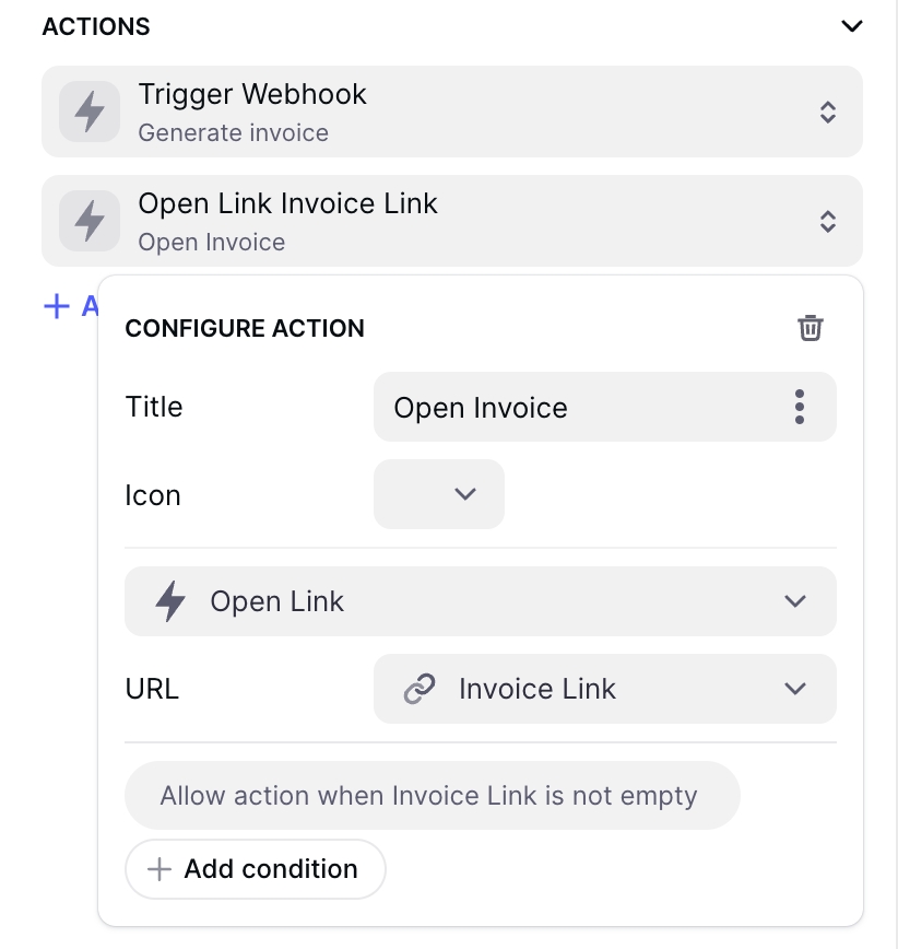 In this combination of actions, we have one button that generates the invoice and one that opens the invoice, which is only shown when the invoice is generated.
