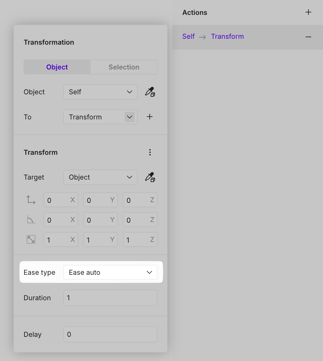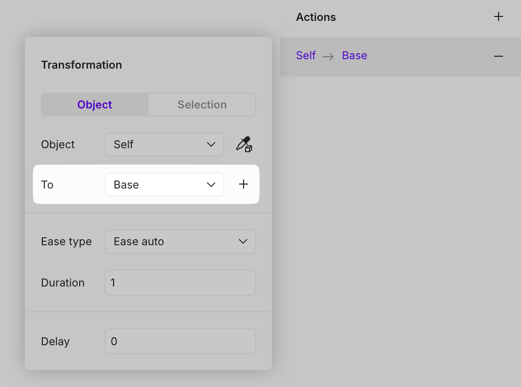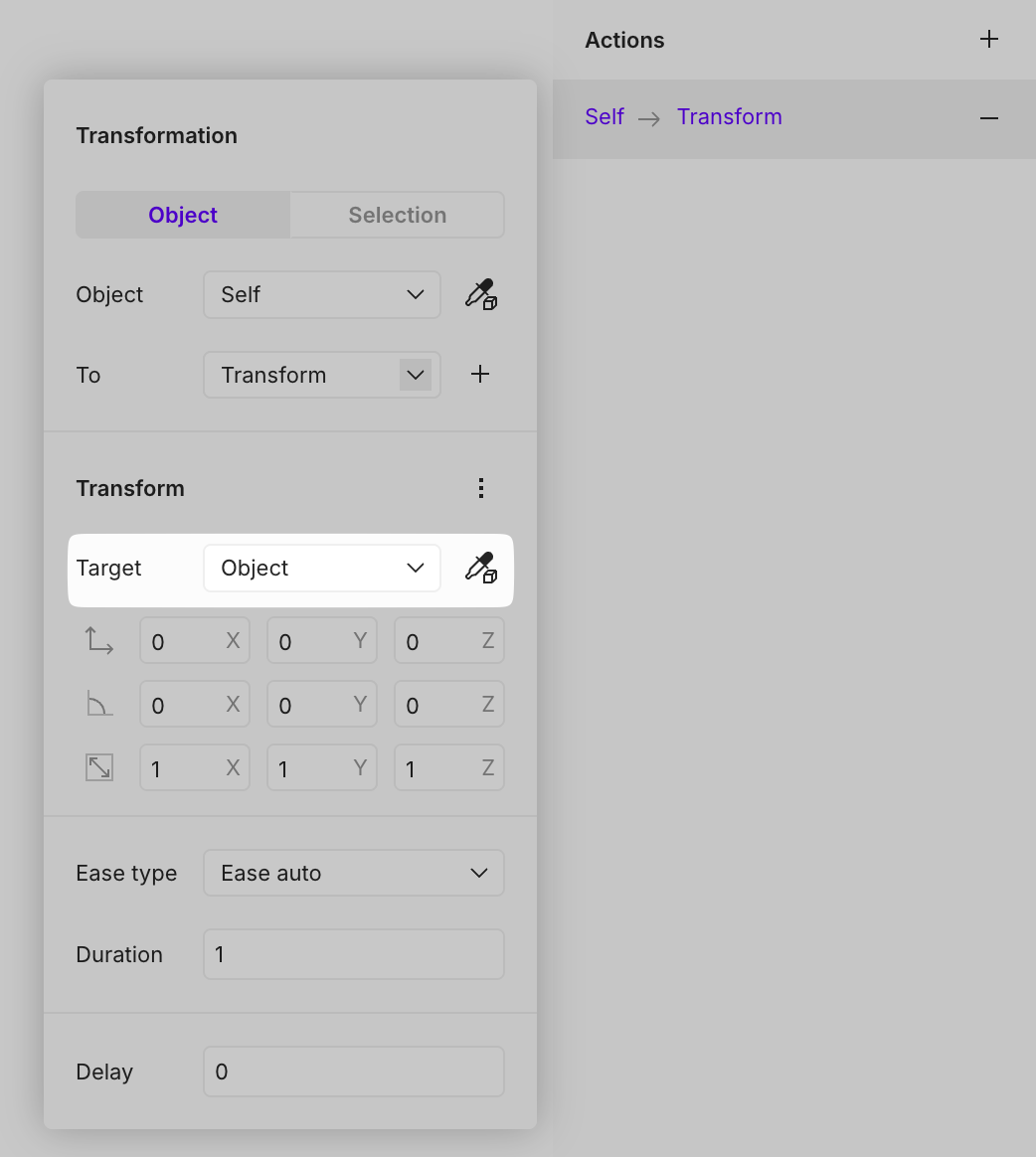 The target can be either a specific object or [selections](https://open-2v.gitbook.com/url/help.vectary.com/documentation/other/selections "mention").