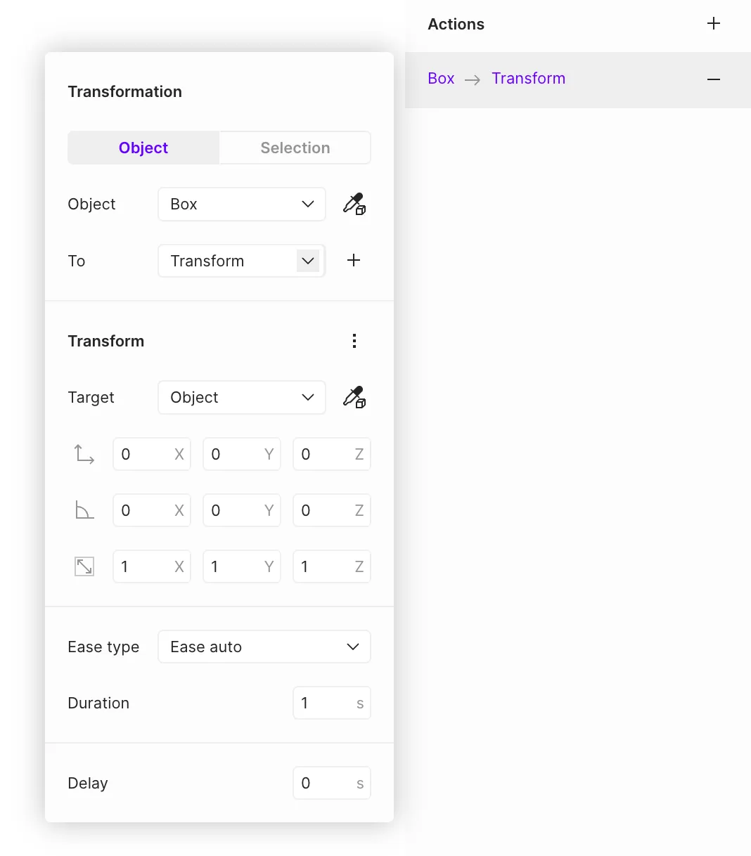 The **Transformation** action allows defining object states and configuring transitions between them. State changes include modifications to an object's position, rotation, and scale.