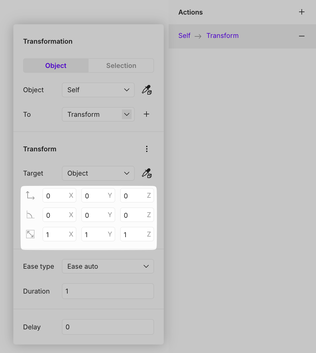 Configures the changes applied to the object in the selected state, including **position, rotation, and scale**.&#x20;
